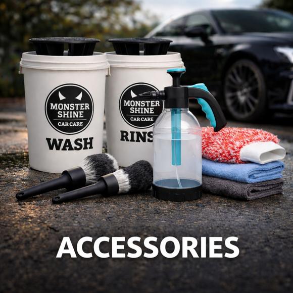 Premium car detailing accessories including brushes, wash mitts, buckets, spray bottles and microfibre cloths.